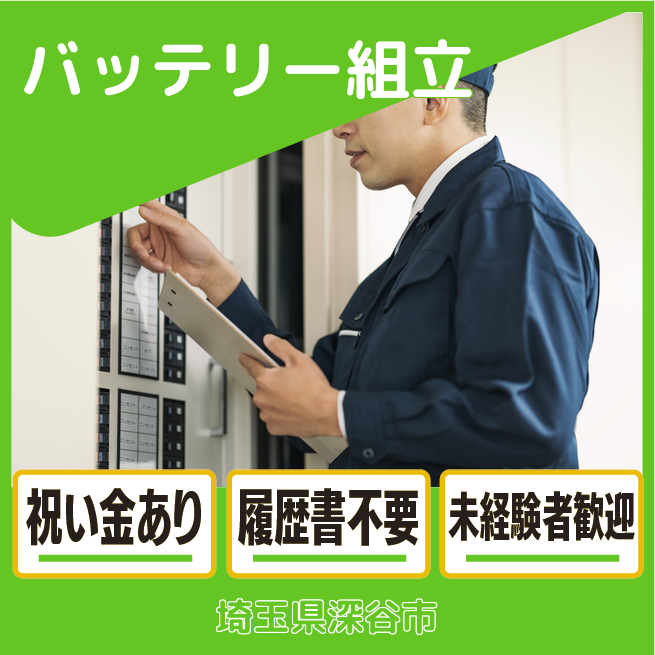 給与詳細 月収例 300,000円 時給例 1,650円 勤務地 埼玉県深谷市 仕事内容 車載用のバッテリー製造を行います。鉛の原料から成形を行う極板工程、バッテリー本体を組み立てる組立工程、製品化するための充電工程、出荷準備を行う梱包工程の4つのポジションがあります。