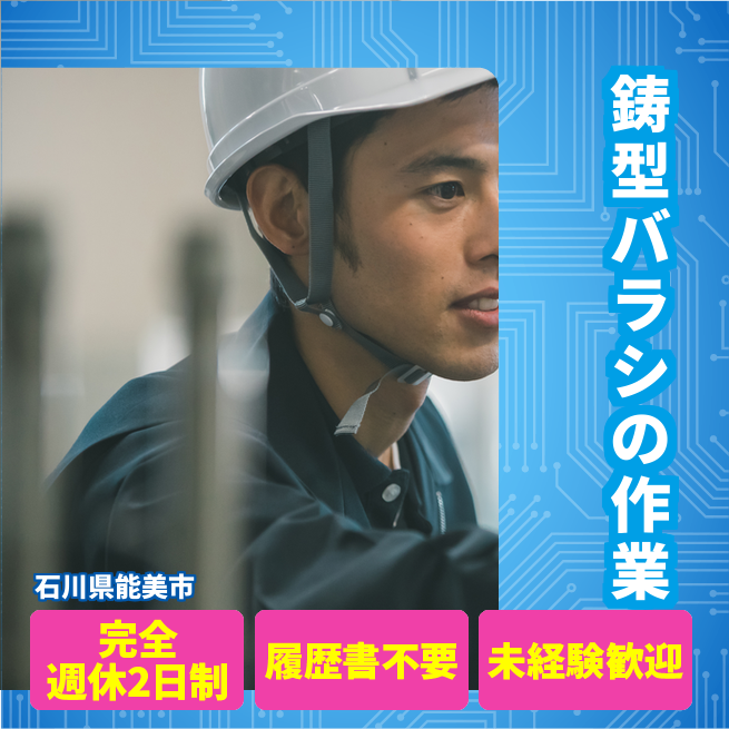 給与詳細 月収例 255,000円 日給例 12,750円 勤務地 石川県能美市 仕事内容 ≪型のバラシ作業≫エンジンに使用される部品を製造している会社さんで、片手ハンマーやグラインダーを使用して、鋳型をばらす作業を担当します。