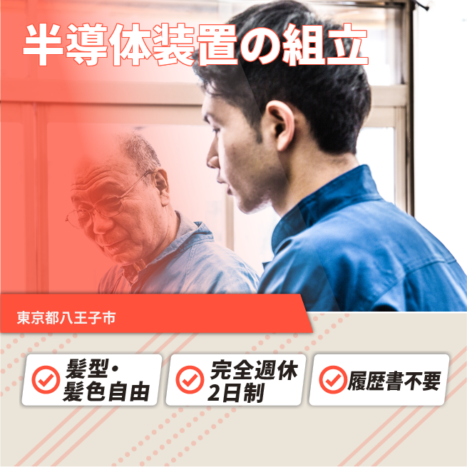 給与詳細 月収例 292,500円 日給例 12,000円 勤務地 東京都八王子市 仕事内容 半導体の製造装置組立作業