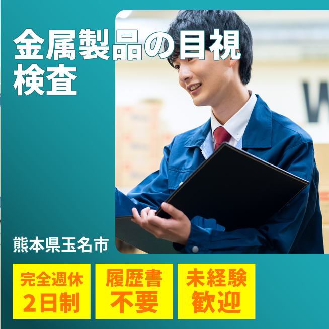 給与詳細 月収例 160,000円 時給例 1,100円 勤務地 熊本県玉名市 仕事内容 ・金属製品(お風呂のフィルター)の目視検査業務