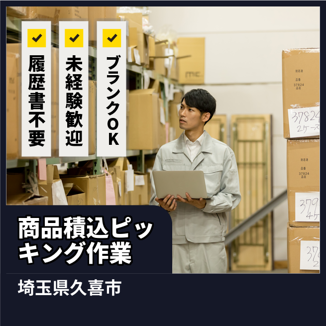 給与詳細 月収例 253,500円 日給例 10,400円 勤務地 埼玉県久喜市 仕事内容 【商品積込ピッキング作業】