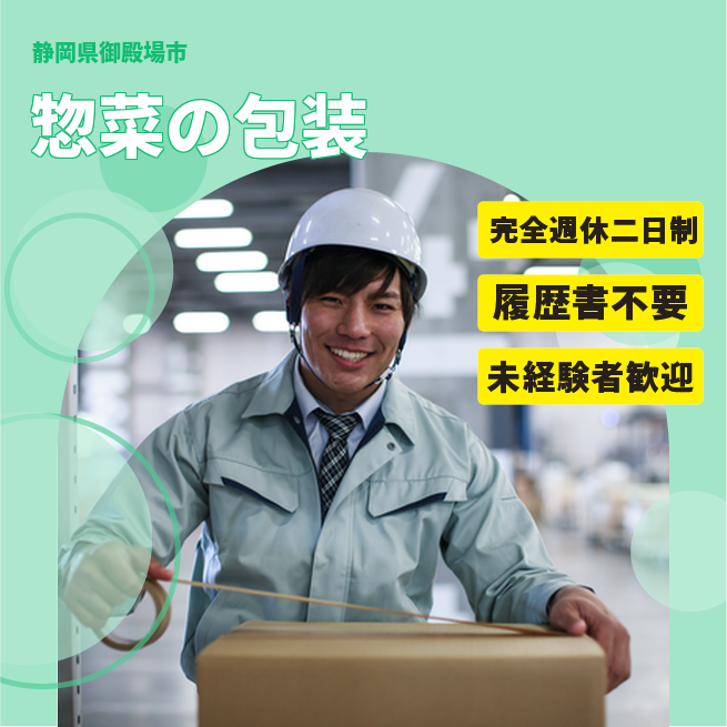給与詳細 月収例 247,650円 日給例 10,160円 勤務地 静岡県御殿場市 仕事内容 製品の梱包や目視検査、箱詰め作業。野菜の運搬、投入、混ぜ合わせの作業など行っていただきます。