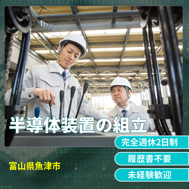 給与詳細 月収例 185,000円 時給例 1,130円 勤務地 富山県魚津市 仕事内容 半導体製造装置の組立作業です。