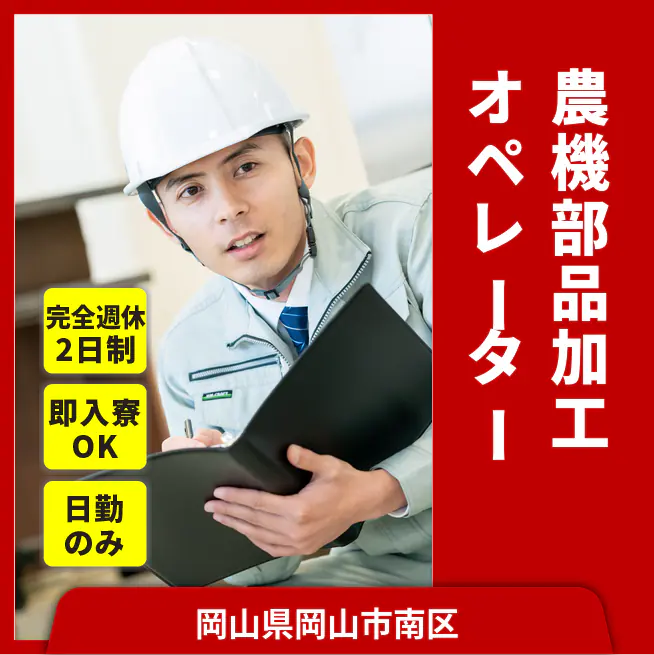 給与詳細 月収例 205,900円 日給例 10,295円 勤務地 岡山県岡山市南区 仕事内容 【農機部品加工オペレーター】