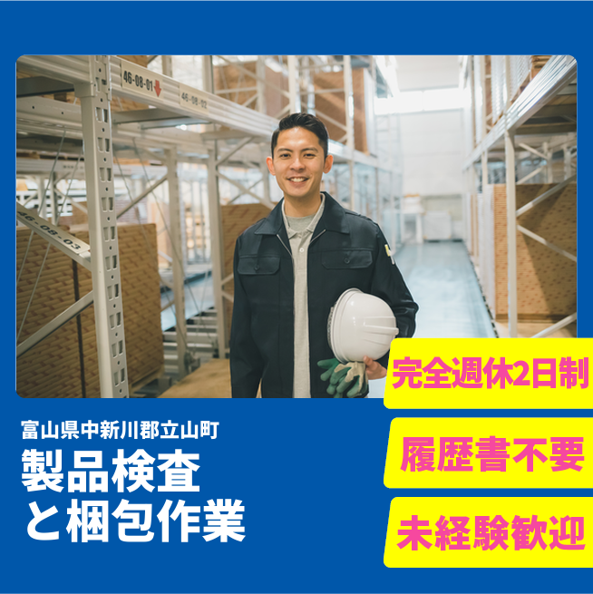 給与詳細 月収例 240,500円 日給例 12,025円 勤務地 富山県中新川郡立山町 仕事内容 【業務内容】