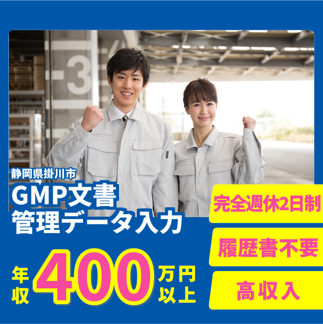 給与詳細 月収例 279,000円 時給例 1,750円 勤務地 静岡県掛川市 仕事内容 薬事部門にて文書管理、データ入力のお仕事