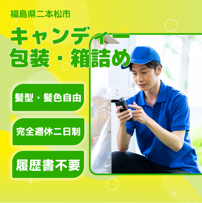 給与詳細 月収例 193,200円 時給例 1,150円 勤務地 福島県二本松市 仕事内容 〇キャンディーの包装と段ボール梱包〇