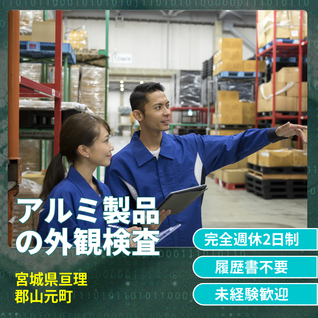 給与詳細 月収例 197,000円 時給例 1,250円 勤務地 宮城県亘理郡山元町 仕事内容 アルミ製品の外観検査、バリ取り