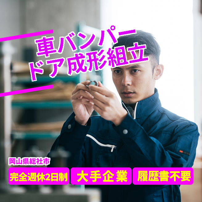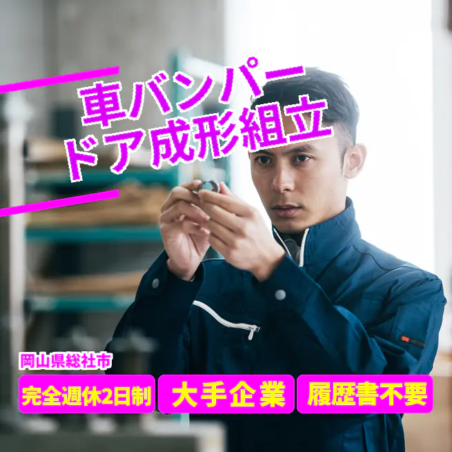 給与詳細 月収例 300,000円 日給例 15,000円 勤務地 岡山県倉敷市 仕事内容 【車バンパードア成形組立】