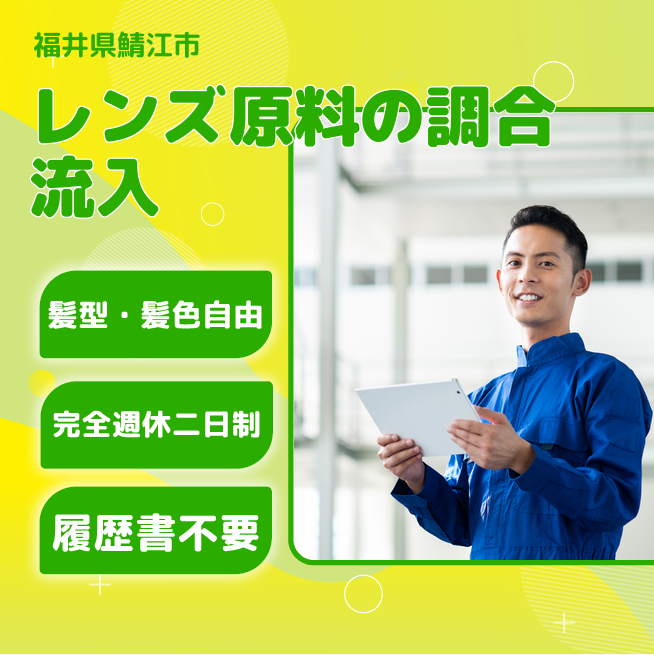 給与詳細 月収例 172,800円 時給例 1,180円 勤務地 福井県鯖江市 仕事内容 モールドというレンズの型の隙間から、調合した液体状の原料を流し込み、オーブンへ投入する作業です。他に、原料の入っていたタンクの洗浄作業も行います。流し込む作業は座って行います。