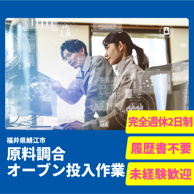 給与詳細 月収例 172,800円 時給例 1,180円 勤務地 福井県鯖江市 仕事内容 【原料調合オーブン投入作業】
