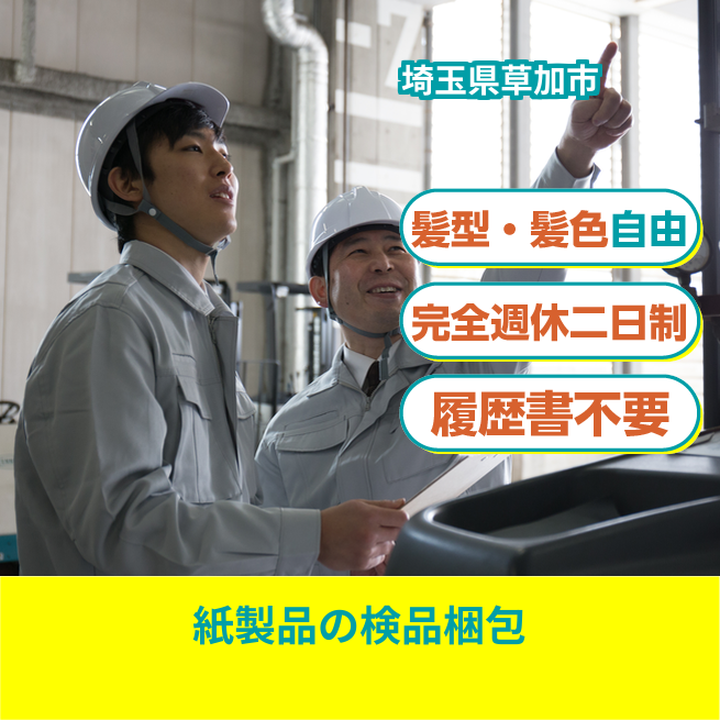 給与詳細 月収例 198,000円 時給例 1,400円 勤務地 埼玉県草加市 仕事内容 紙製品の目視検査および詰め替え業務・梱包作業及び発送関連業務