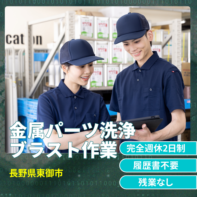 給与詳細 月収例 234,000円 時給例 1,200円 勤務地 長野県東御市 仕事内容 【金属パーツ洗浄ブラスト作業】