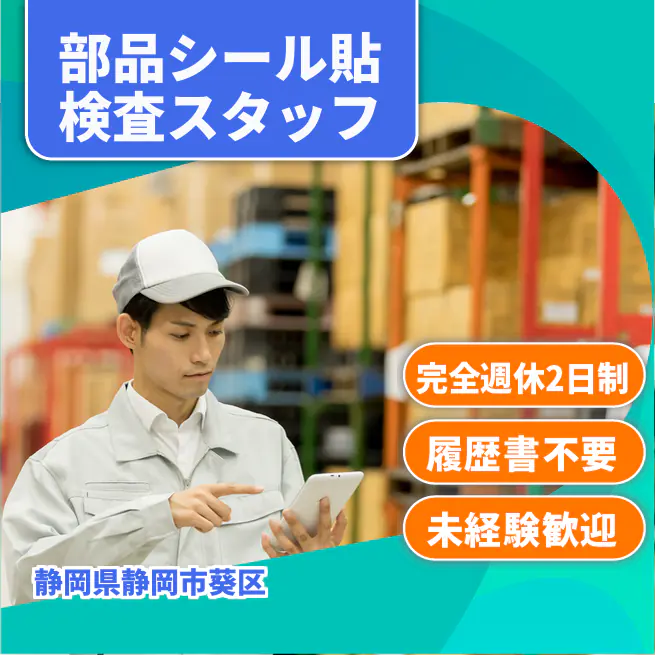 給与詳細 月収例 200,000円 日給例 10,000円 勤務地 静岡県静岡市葵区 仕事内容 【部品シール貼検査スタッフ】