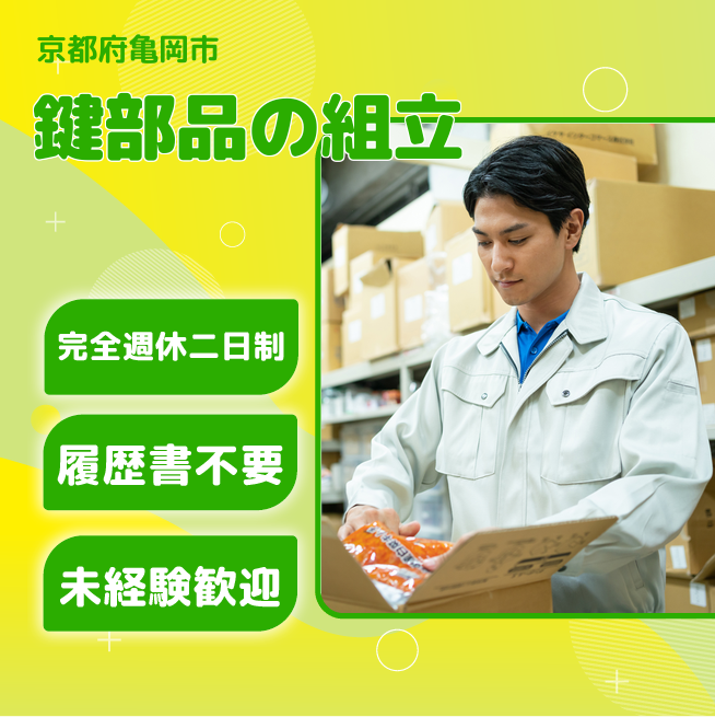 給与詳細 月収例 184,000円 時給例 1,130円 勤務地 京都府亀岡市 仕事内容 鍵の金属部品(ドアロック)の組立や梱包する、チェックシートにある検査項目に沿って検査、出来上がった製品の梱包などの作業をしていただきます。