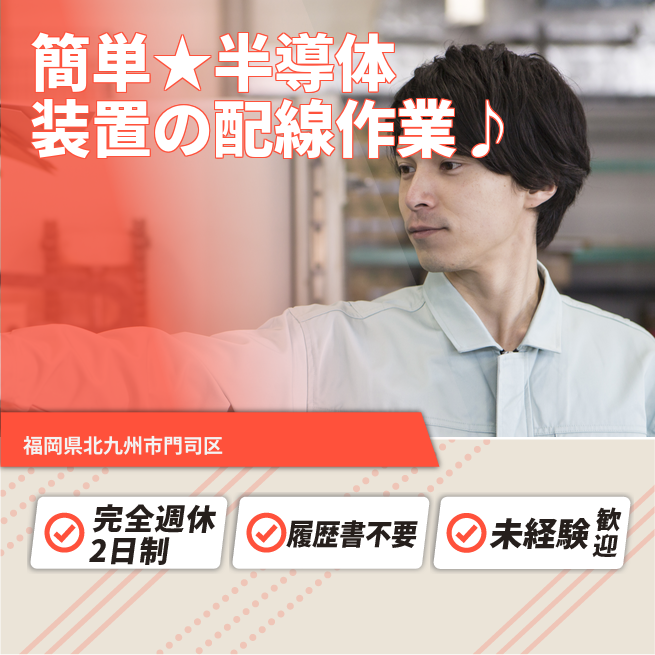 給与詳細 月収例 160,000円 時給例 1,200円 勤務地 福岡県北九州市門司区 仕事内容 クリーンルーム内での配線やネジ締めなど未経験でもOK!椅子に座ってする作業がメイン。日勤、土日祝休み、残業なし!女性が大活躍中のお仕事です!