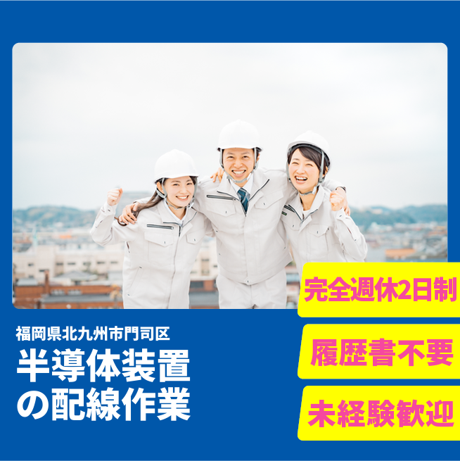 給与詳細 月収例 160,000円 時給例 1,200円 勤務地 福岡県北九州市門司区 仕事内容 【業務内容】半導体製造装置の組み立て作業