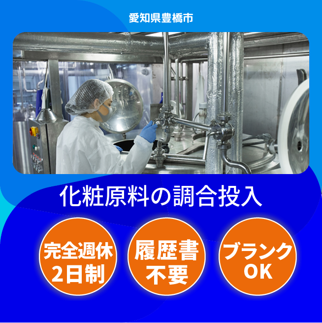 給与詳細 月収例 273,000円 日給例 11,200円 勤務地 愛知県豊橋市 仕事内容 計量配合(原料の加工製造)