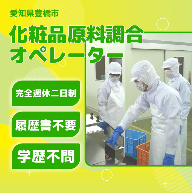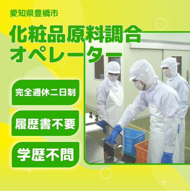 給与詳細 月収例 273,000円 日給例 11,200円 勤務地 愛知県豊橋市 仕事内容 【化粧品原料調合オペレーター】