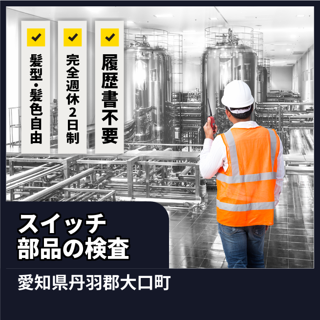給与詳細 月収例 270,000円 時給例 1,650円 勤務地 愛知県丹羽郡大口町 仕事内容 自動車用スイッチ部品の組立・検査作業。コの字型に作業場に並び、自分の担当の組立、検査をしてから次の人に回す流れ。私服の上に防塵着を羽織って作業をします