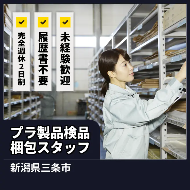 給与詳細 月収例 170,000円 時給例 1,050円 勤務地 新潟県三条市 仕事内容 【プラ製品検品梱包スタッフ】