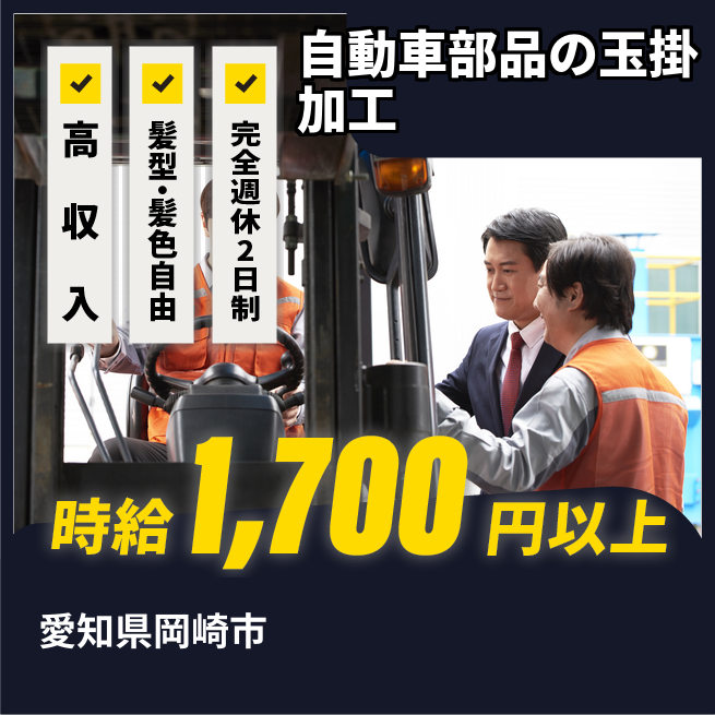給与詳細 月収例 297,980円 時給例 1,700円 勤務地 愛知県岡崎市 仕事内容 自動車のオイルパイプやエンジン部品を作る会社