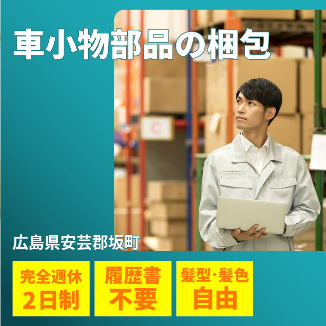 給与詳細 月収例 235,000円 日給例 11,750円 勤務地 広島県安芸郡坂町 仕事内容 女性は片手サイズの自動車小物部品を作業台の上で段ボール箱に入れる仕分け梱包作業。