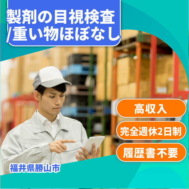 給与詳細 月収例 253,000円 日給例 12,650円 勤務地 福井県勝山市 仕事内容 ≪医薬品の目視検査≫ クリーンルーム内で、製剤の目視検査、機械部品や製剤容器の清掃・洗浄などの作業を行います。 取次程度の社内電話対応があります。 座り作業がメインです。