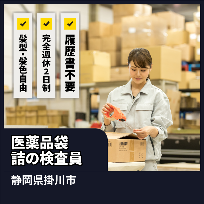 【製品】市販の医薬品【作業内容】機械ラインで袋詰めされるため、その監視及び検査。袋詰めされた製品を検査しながら箱詰めする作業。【重量】個包装されているため重量物なし【座り立ち】ラインにより座り作業、立ち作業がある【ラインorセル】ライン【その他】一日の中でライン内ローテーションあり