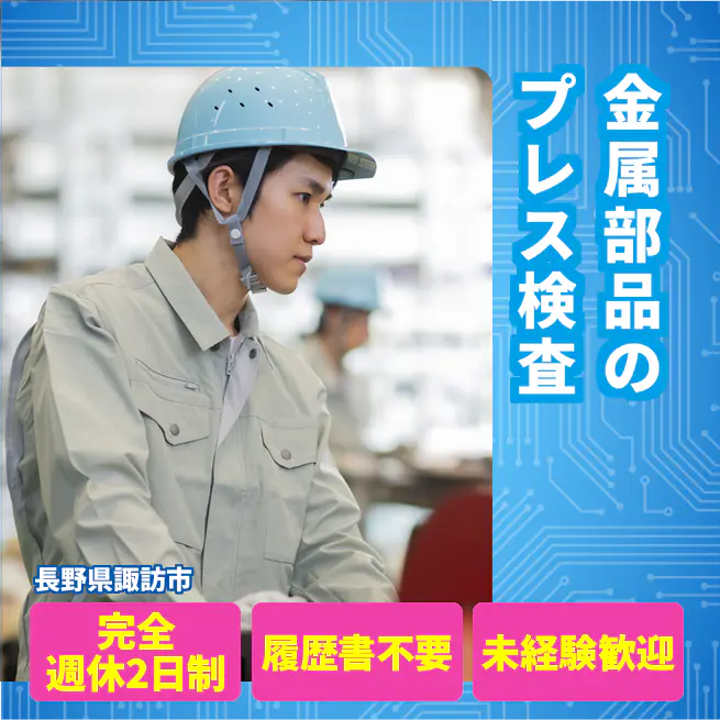 給与詳細 月収例 200,000円 日給例 10,000円 勤務地 長野県諏訪市 仕事内容 金属部品のプレス機械のオペレーターをお願いします。プログラミングは設定済みですので難しい作業はありません。簡単な抜き取り検査もあります。
