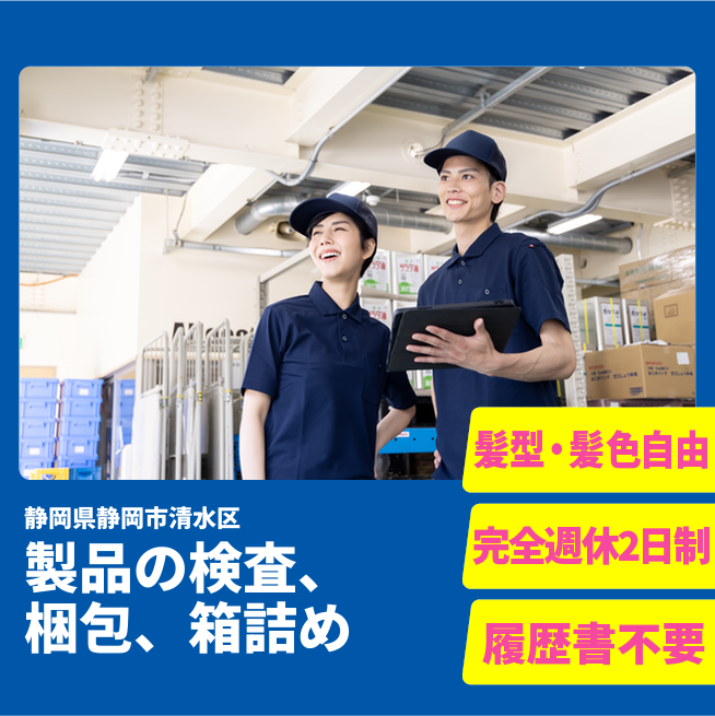 給与詳細 月収例 260,000円 日給例 13,000円 勤務地 静岡県静岡市清水区 仕事内容 日勤&製品の検査、梱包、箱詰めのお仕事です♪