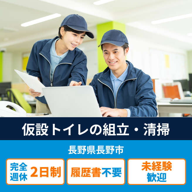 給与詳細 月収例 161,000円 時給例 1,200円 勤務地 長野県長野市 仕事内容 イベントや建設現場で使用する仮設トイレの清掃・組立のお仕事です。