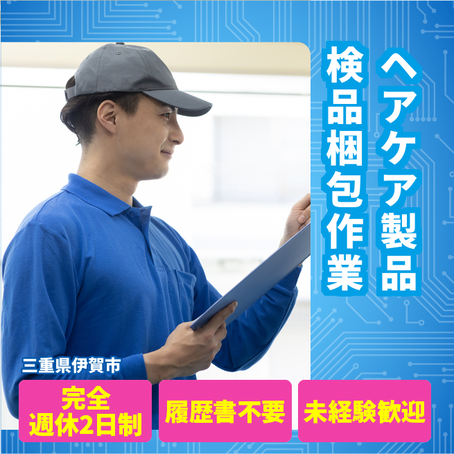 給与詳細 月収例 250,000円 日給例 12,500円 勤務地 三重県伊賀市 仕事内容 【ヘアケア製品検品梱包作業】
