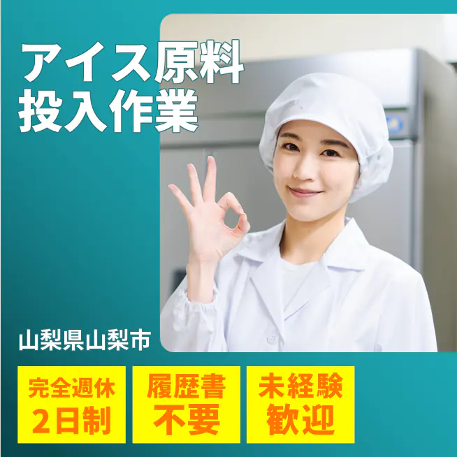 給与詳細 月収例 150,000円 時給例 1,150円 勤務地 山梨県山梨市 仕事内容 【業務内容】アイスクリーム製造工場でのオペレーターと検査、梱包に関する業務