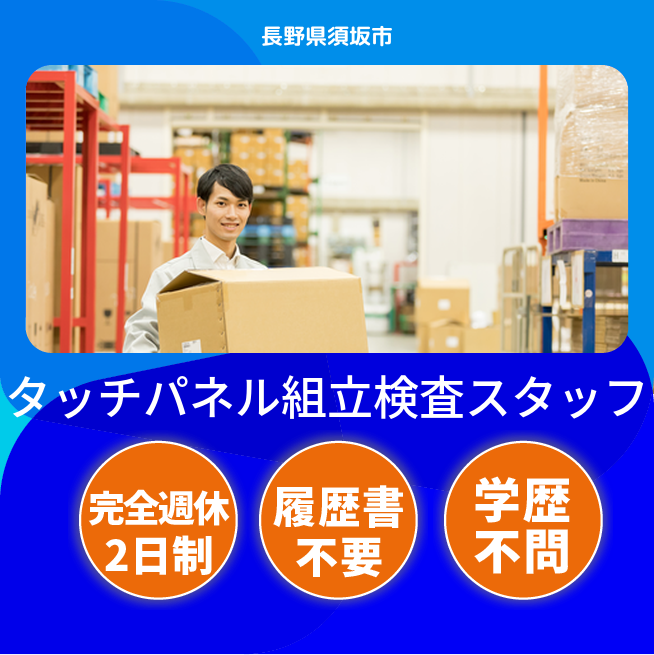 給与詳細 月収例 210,000円 日給例 10,500円 勤務地 長野県須坂市 仕事内容 【タッチパネル組立検査スタッフ】