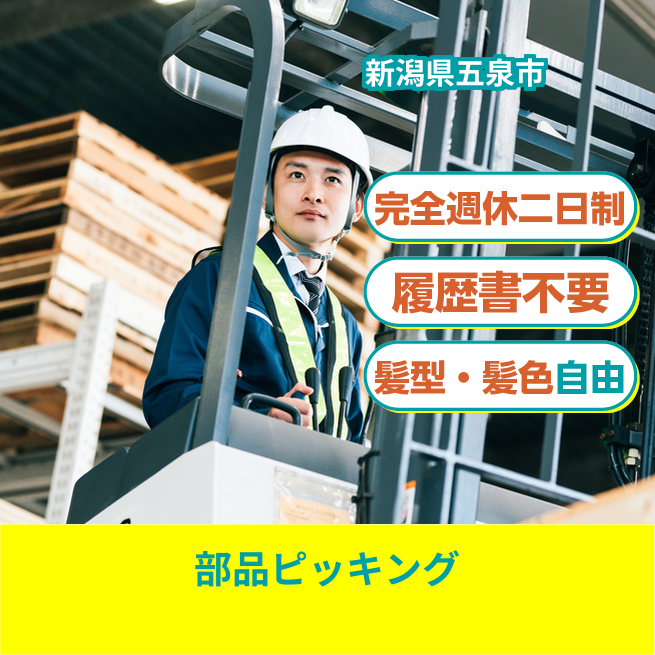 自動車部品工場の倉庫でピッキング・金属くず回収を行う軽作業。場面によりフォーク乗車あり。
