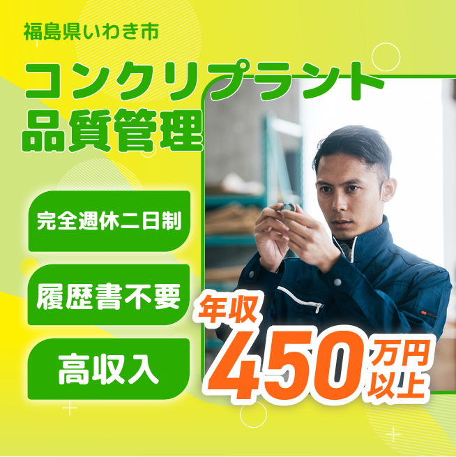 給与詳細 月収例 312,000円 時給例 1,950円 勤務地 福島県いわき市 仕事内容 【コンクリプラント品質管理】