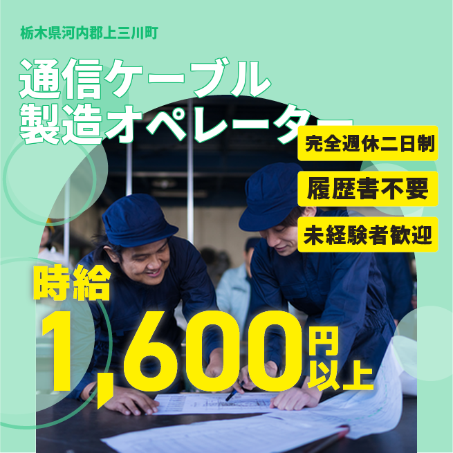 給与詳細 月収例 331,347円 時給例 1,650円 勤務地 栃木県河内郡上三川町 仕事内容 【通信ケーブル製造オペレーター】