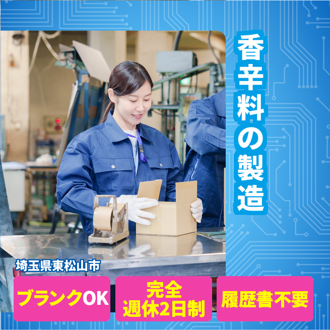 給与詳細 月収例 198,000円 時給例 1,230円 勤務地 埼玉県東松山市 仕事内容 スパイスの製造、検品、梱包、出荷及び付帯業務