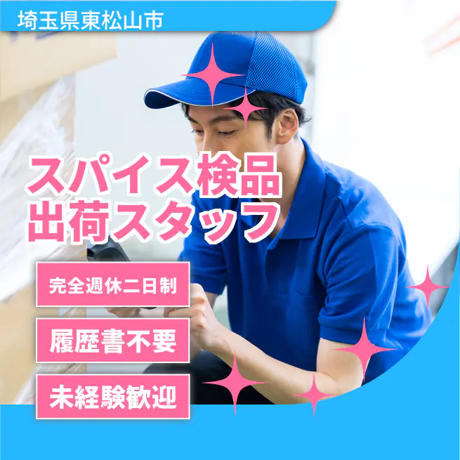 給与詳細 月収例 198,000円 時給例 1,230円 勤務地 埼玉県東松山市 仕事内容 【スパイス検品出荷スタッフ】