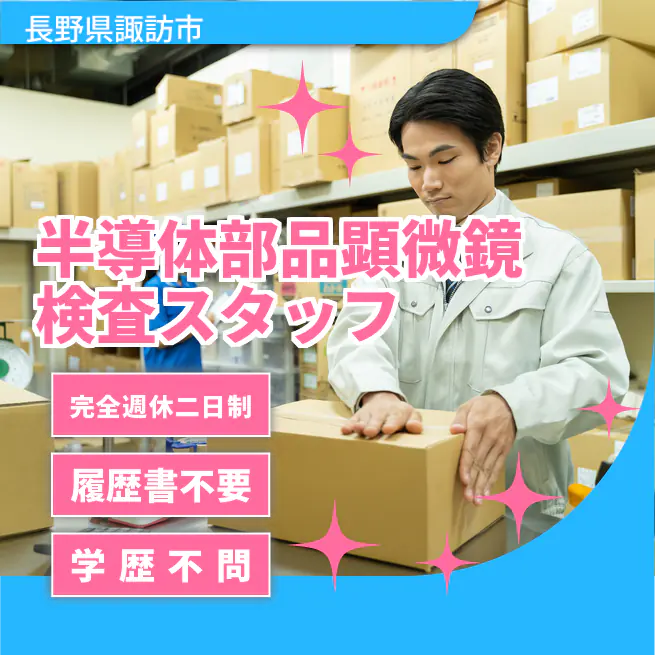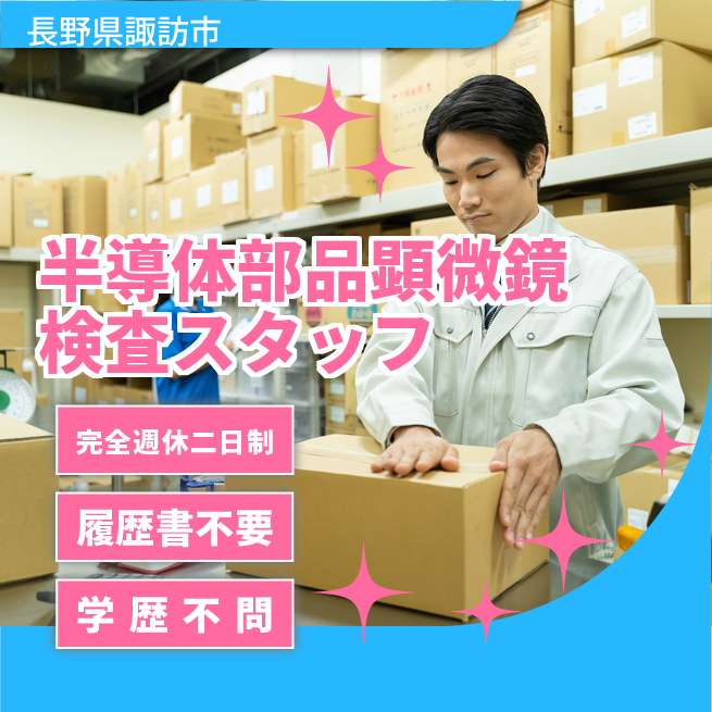 給与詳細 月収例 178,000円 時給例 1,150円 勤務地 長野県諏訪市 仕事内容 【半導体部品顕微鏡検査スタッフ】