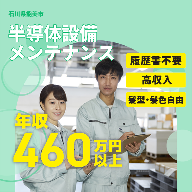 給与詳細 年収例 4,320,000円 月収例 360,000円 勤務地 石川県能美市 仕事内容 【半導体設備メンテナンス】