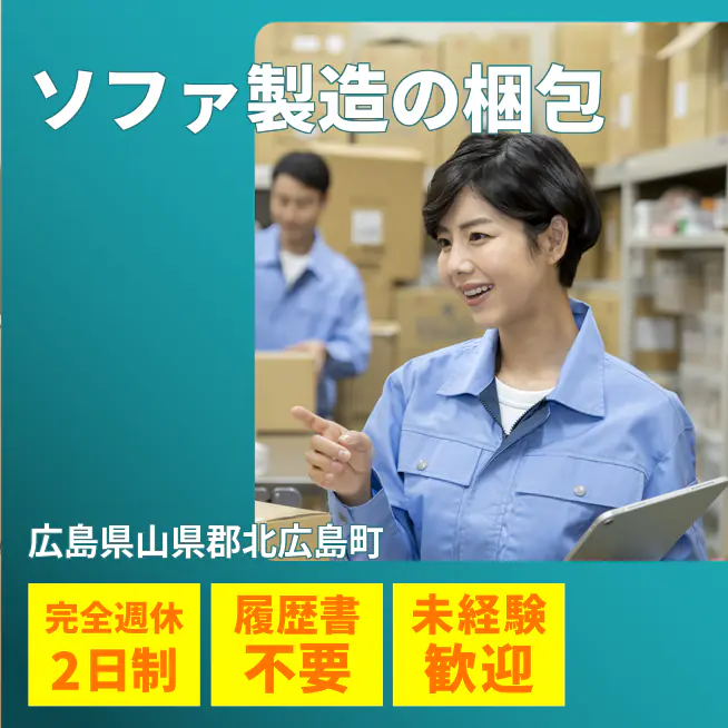給与詳細 月収例 270,000円 日給例 13,500円 勤務地 広島県山県郡北広島町 仕事内容 ウレタン部材へのカバー装着および縫合工程、2名体制によるソファ本体の持ち上げ・反転作業、ならびに最終工程としてのビニール掛けおよび梱包作業で構成されております。いずれの作業も標準化された手順に基づき遂行するものであり、未経験者においても短期間で習熟可能な内容となっております。