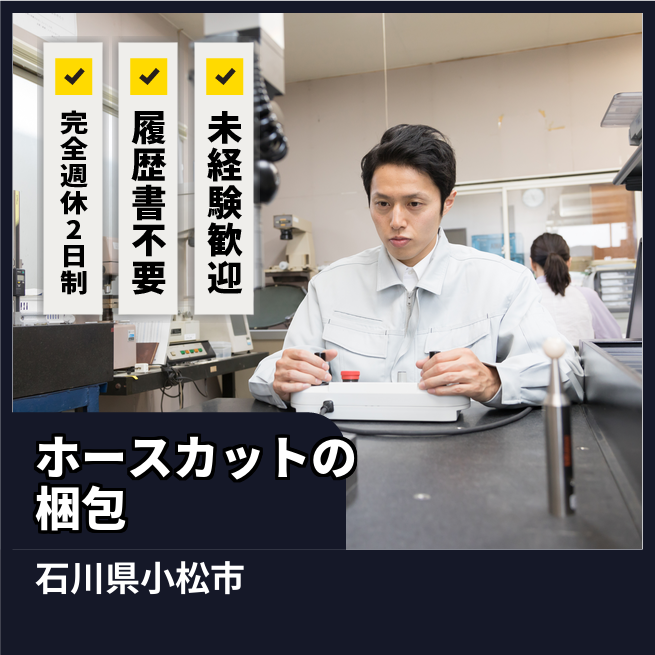 給与詳細 例 0円 日給例 10,175円 勤務地 石川県小松市 仕事内容 ≪ホースのカット・梱包作業≫