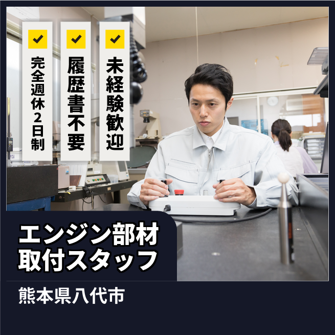 ゆったりとしたスピードで流れてくるエンジン部品に専用工具を使用し部品を取り付けていく作業です。・部品自体は金属製となるので多少の重みはありますが、 女性でも持てる重量の部品です。・丁寧な指導があります。工場未経験の方も活躍している現場です・事前の職場見学も受付中です。