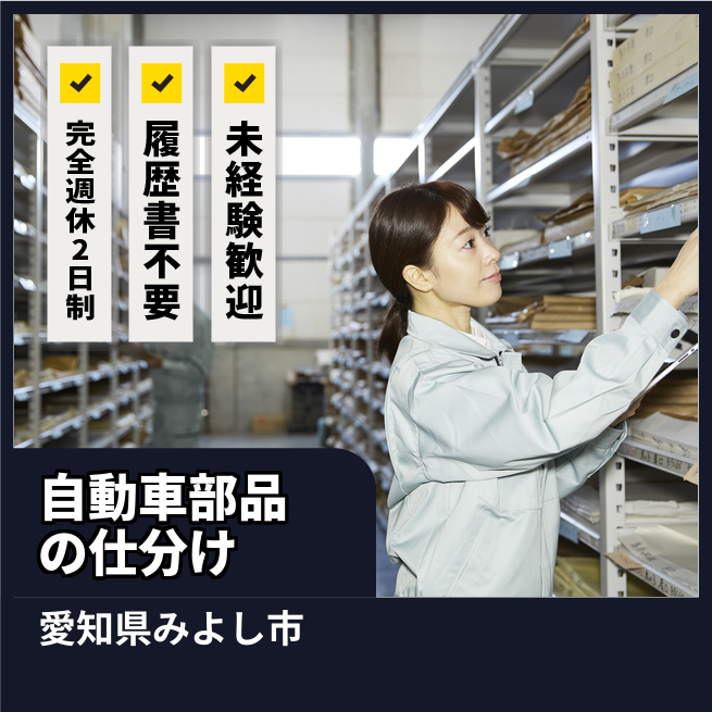 自動車部品が入った箱を指定の場所へ移動させたり、積み上げたりする業務。【通勤手段】