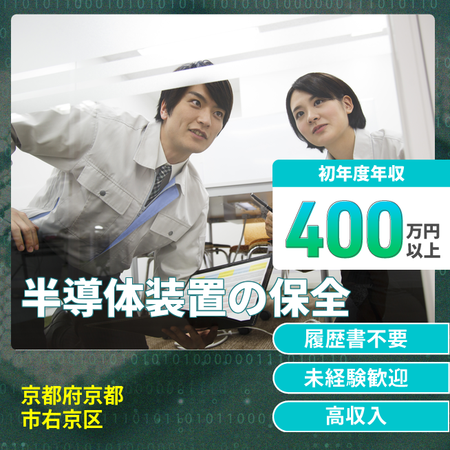 給与詳細 年収例 4,535,424円 月収例 377,952円 勤務地 京都府京都市右京区 仕事内容 設備メンテ経験有(半導体業界以外もOK)自宅通勤工場内での半導体製造装置の部品や材料の定期的な交換やメンテナンス業務(機械の故障の修繕や修理ではないです)半導体製造装置の管理、改善業務。装置の異常、確認はクリーンルーム内での作業となる。