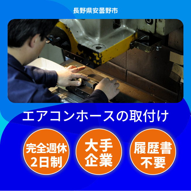 給与詳細 例 0円 日給例 10,400円 勤務地 長野県安曇野市 仕事内容 車のカーエアコンホースの組付け、固着、カシメ、挿入、水検、部品のピッキング業務。