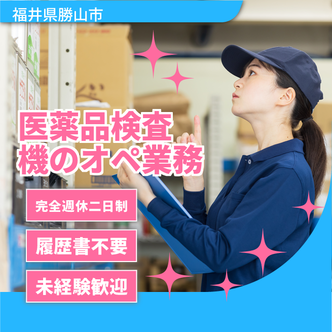 給与詳細 月収例 284,000円 日給例 14,200円 勤務地 福井県勝山市 仕事内容 担当して頂く部署は、医薬品のビデオ検査機械のオペレーター業務です。