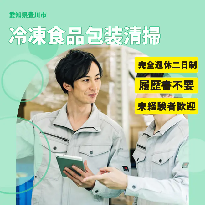 給与詳細 月収例 243,750円 日給例 10,000円 勤務地 愛知県豊川市 仕事内容 【冷凍食品包装清掃】